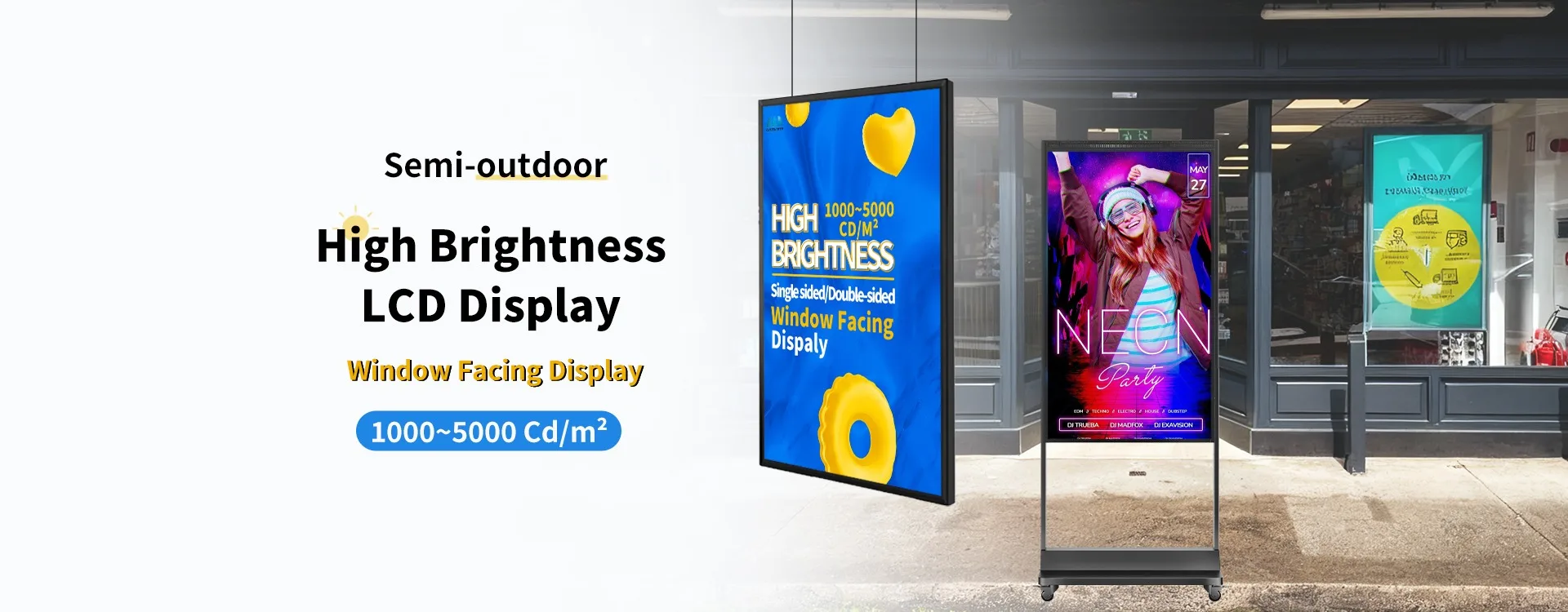 Our high-brightness window display offers 1000~5000 nits, ensuring visibility in direct sunlight. Supports 2K/4K resolution, Android OS, WiFi, CMS remote control, flexible installation, and USB plug & play.